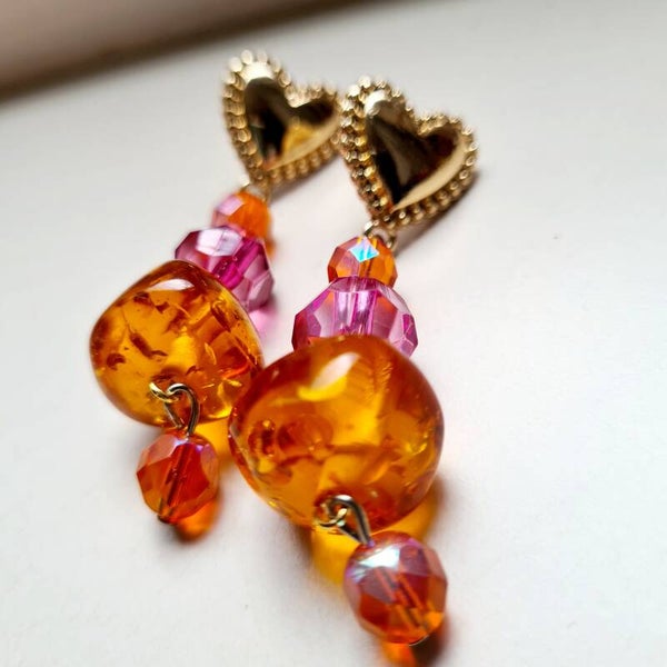 Mooie oranje/roze oorbellen gemaakt van verschillende kralen: facetgeslepen glas en kunststof kralen Deze oorbellen zijn handmade by Into Accessories. Alle sieraden worden gemaakt van gerecyclede materialen. Een hoop sieraden krijgen hierdoor een tweede leven vaak in een totaal andere vorm. We are INTO zerowaste💜