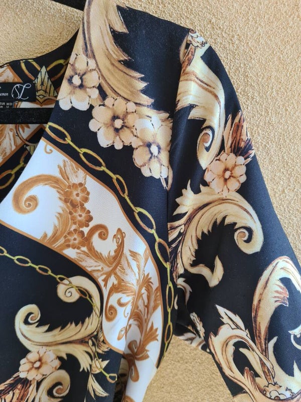 Prachtige preloved jurkje met een prachtige goudkleurige barokprint van het merk Smashed lemon.De jurk heeft klein beetje wijduitlopende mouwen en een strap in dezelfde print om de taille te accenturen.