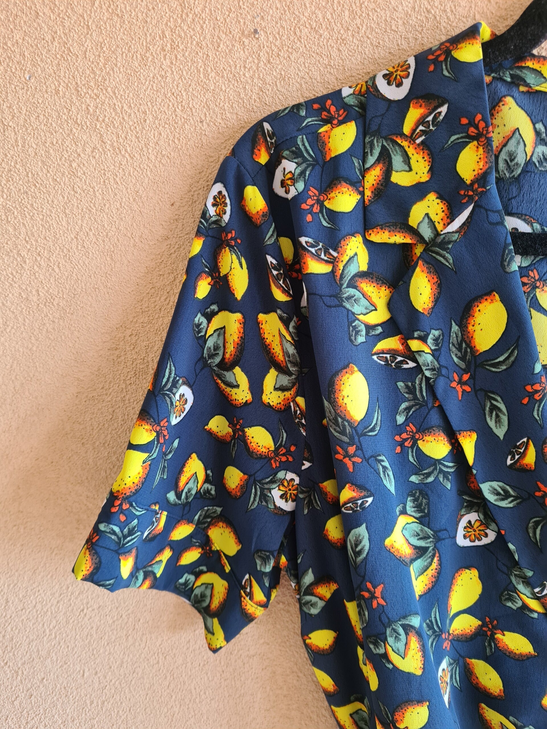 Prachtige preloved jurkje met een te gekke citroen print van het merk WE.De jurk heeft korte mouwen,V hals en een strap in dezelfde print om de taille te accenturen.