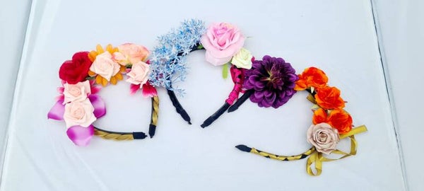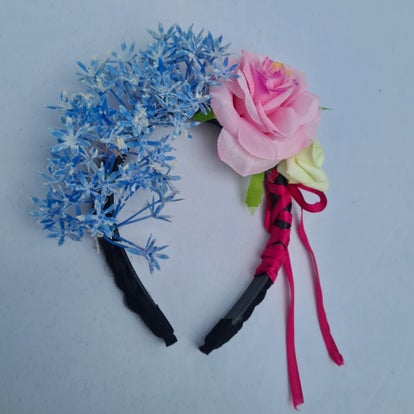 Prachtige flowercrown gemaakt van blauw, roze en beige kleurige kunstbloemen. Deze bloemenkroon is met de handgemaakt van gerecycelde onderdelen.