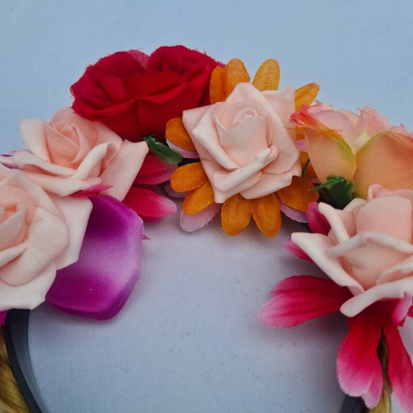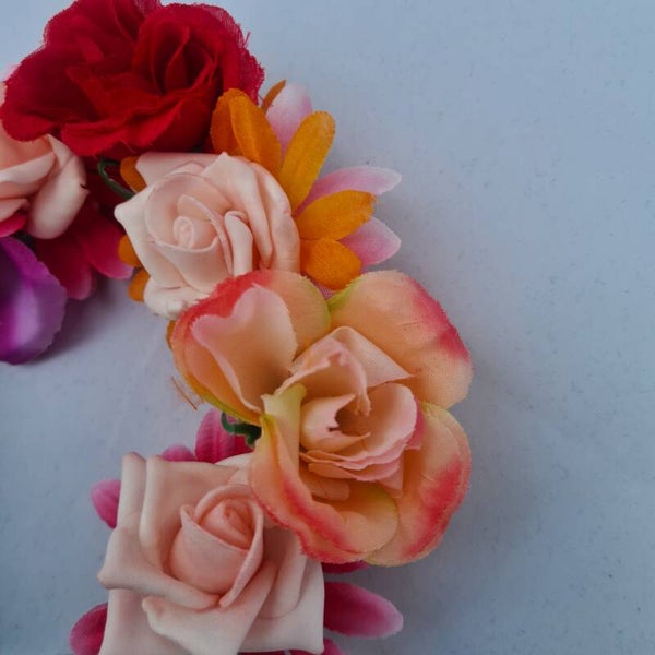 Prachtige bloemenkroon met de handgemaakt door into accessories van gerecyclede kunstbloemen en overige materialen. De rozen zijn bevestigd met een groenkleurig ijzerdraadje aan een diadeem met honingblond imitatiehaar.De prachtige kleuren combinatie van rood, zalm, roze en oranje geeft een geweldig effect.