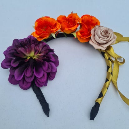 Prachtige flowercrown gemaakt van paars, beige en oranje kleurige kunstbloemen. De bloemen zijn vastgezet met een groenkleurig ijzerdraad aan een zwarte diadeem van textiel. Om de flowercrown af te maken hebben we aan de linkerzijde een prachtig goudkleurig lint geknoopt. Alle flowercrowns worden met de handgemaakt door Into Accessories van gerecyclede materialen. Dit maakt de flowercrown uniek.