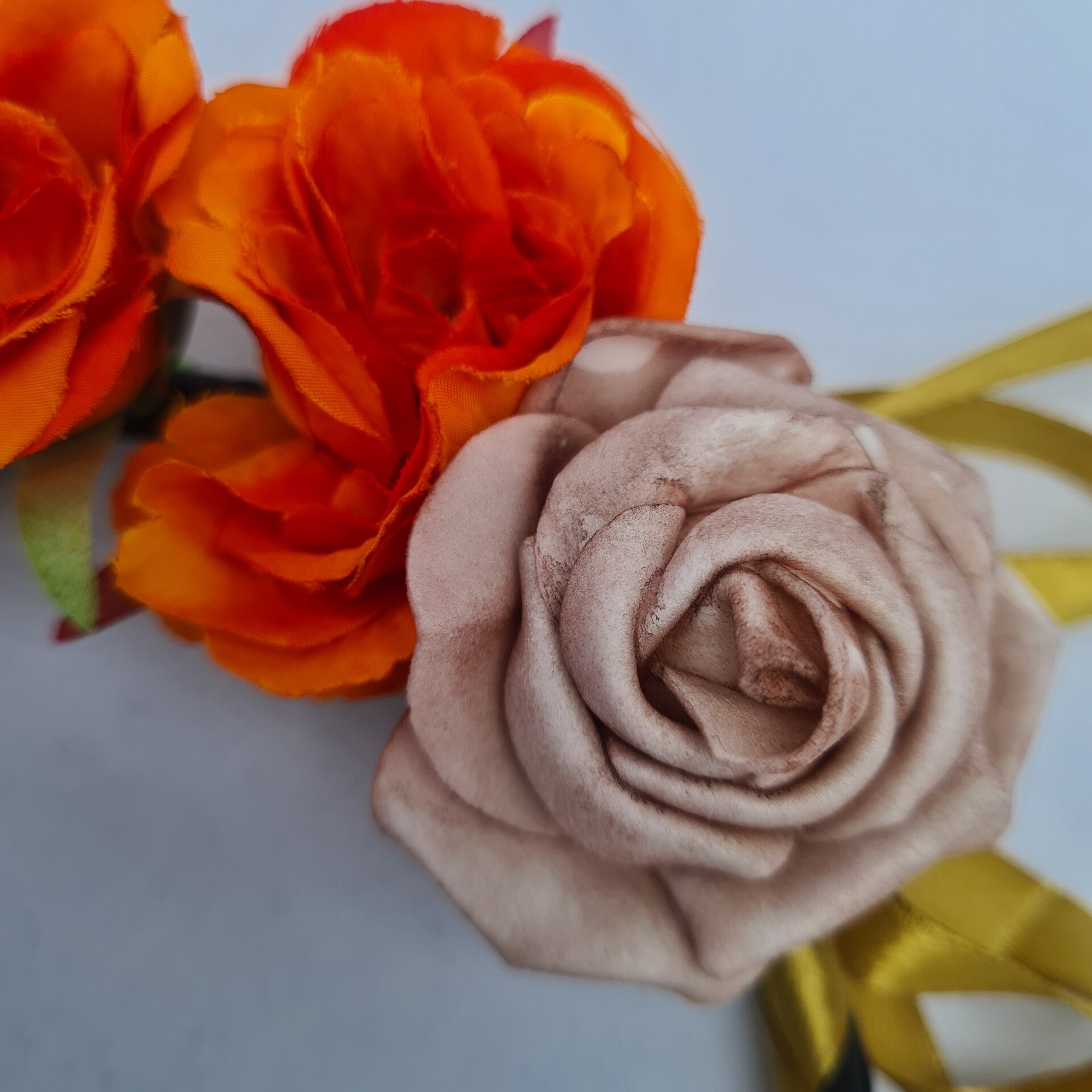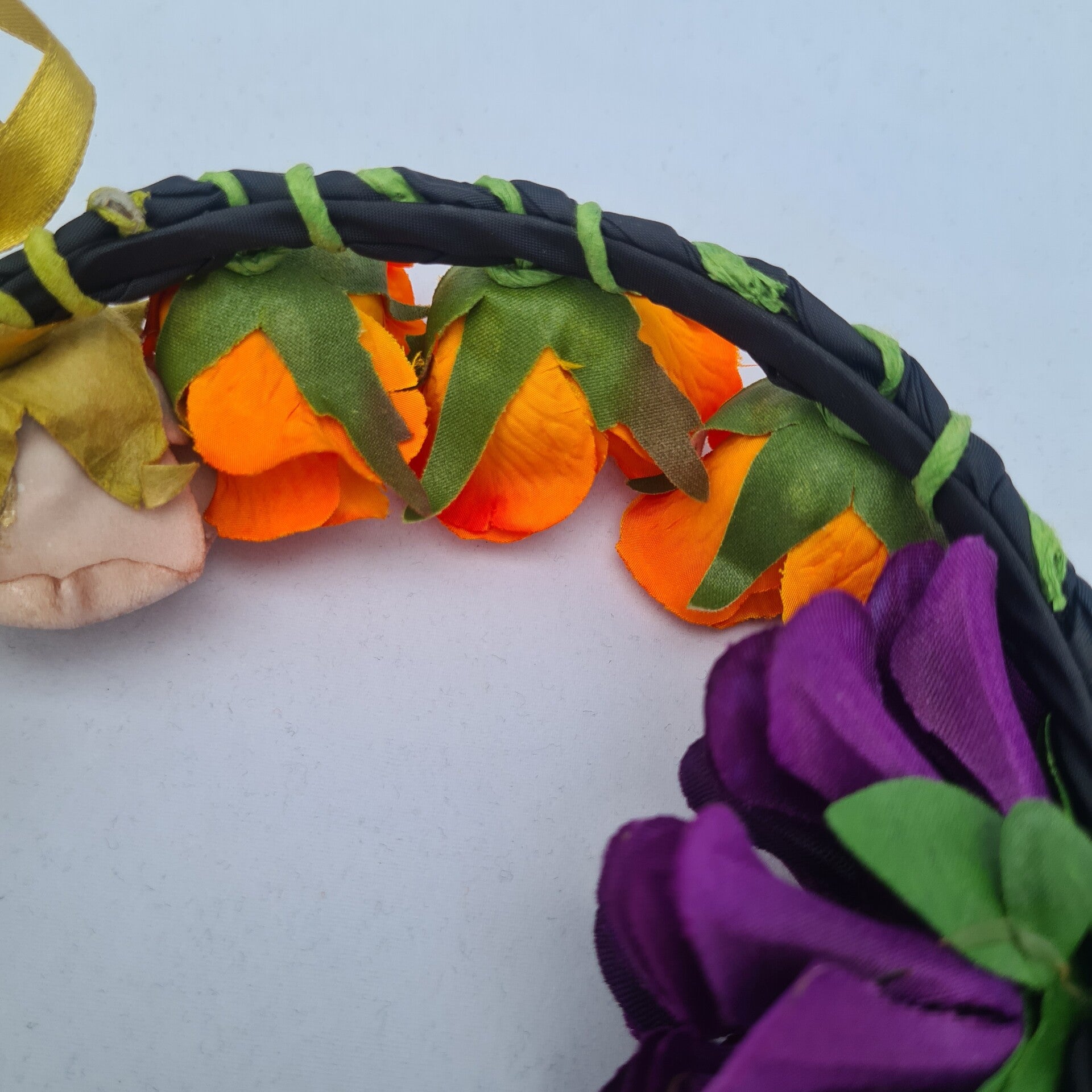 Prachtige flowercrown gemaakt van paars, beige en oranje kleurige kunstbloemen. De bloemen zijn vastgezet met een groenkleurig ijzerdraad aan een zwarte diadeem van textiel. Om de flowercrown af te maken hebben we aan de linkerzijde een prachtig goudkleurig lint geknoopt. Alle flowercrowns worden met de handgemaakt door Into Accessories van gerecyclede materialen. Dit maakt de flowercrown uniek.