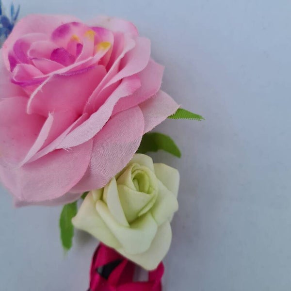 Prachtige bloemenkroon met de handgemaakt door into accessories van gerecyclede kunstbloemen en overige materialen. De rozen zijn bevestigd met een groenkleurig ijzerdraadje aan een diadeem met honingblond imitatiehaar.De prachtige kleuren combinatie van rood, zalm, roze en oranje geeft een geweldig effect.