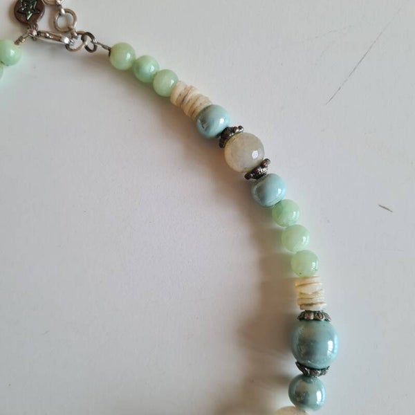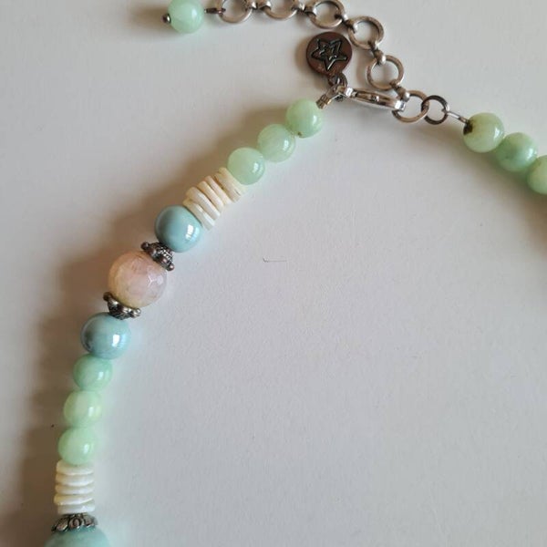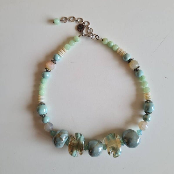 Deze ketting is een echte eyecatcher! Gemaakt van verschillende kralen waaronder murano, keramiek en facet geslepen glaskralen.Prachtige samenstelling van kralen uit hetzelfde kleurenpalet.Ik.was op slag verliefd wat een mooie zachtroze kleuren.Combineer met een mooi bloemenjurkje of draag deze ketting store op een basic shirt and jeans.Dit item is preloved en heb ik met alle liefde uitgezocht om in het te gekke concept te passen.