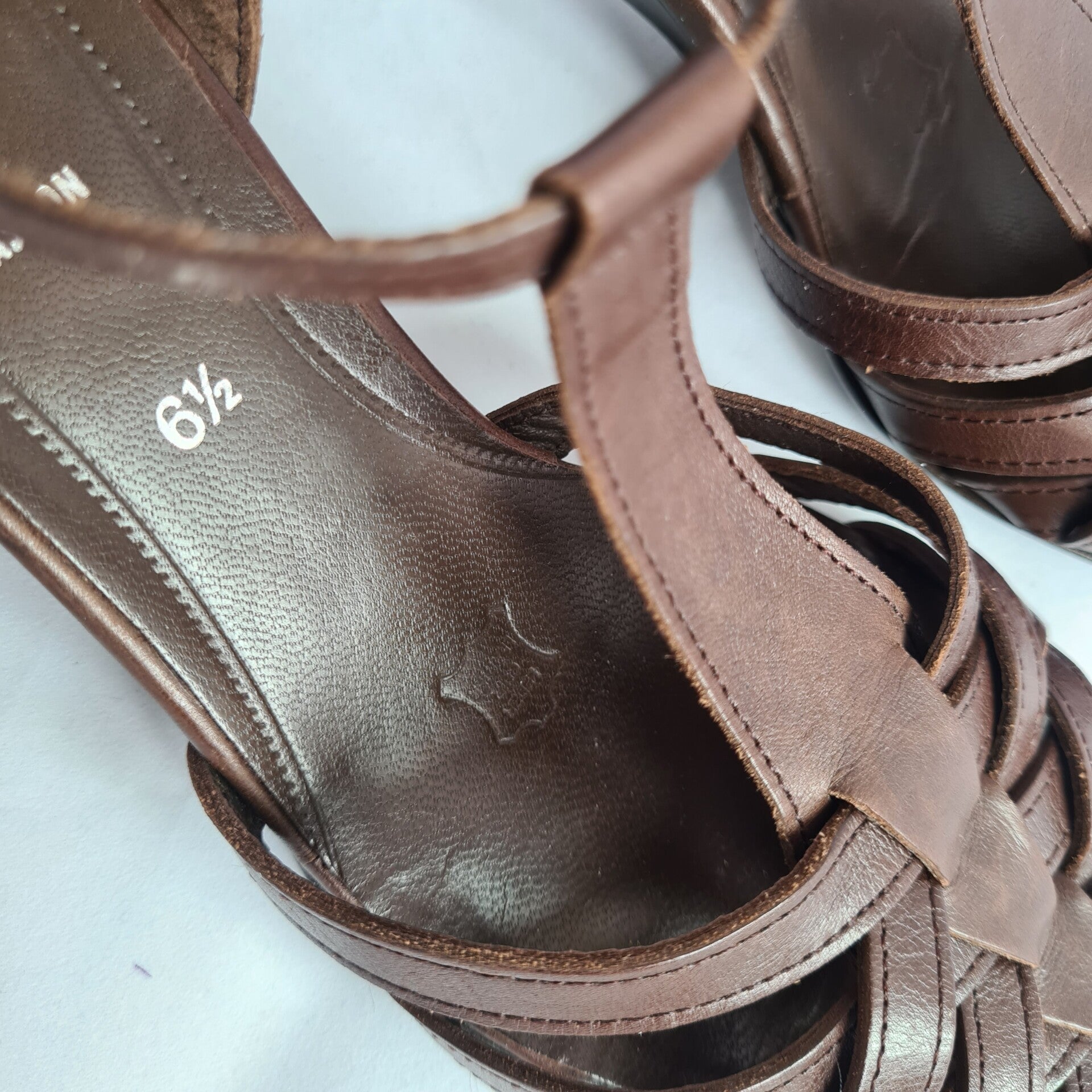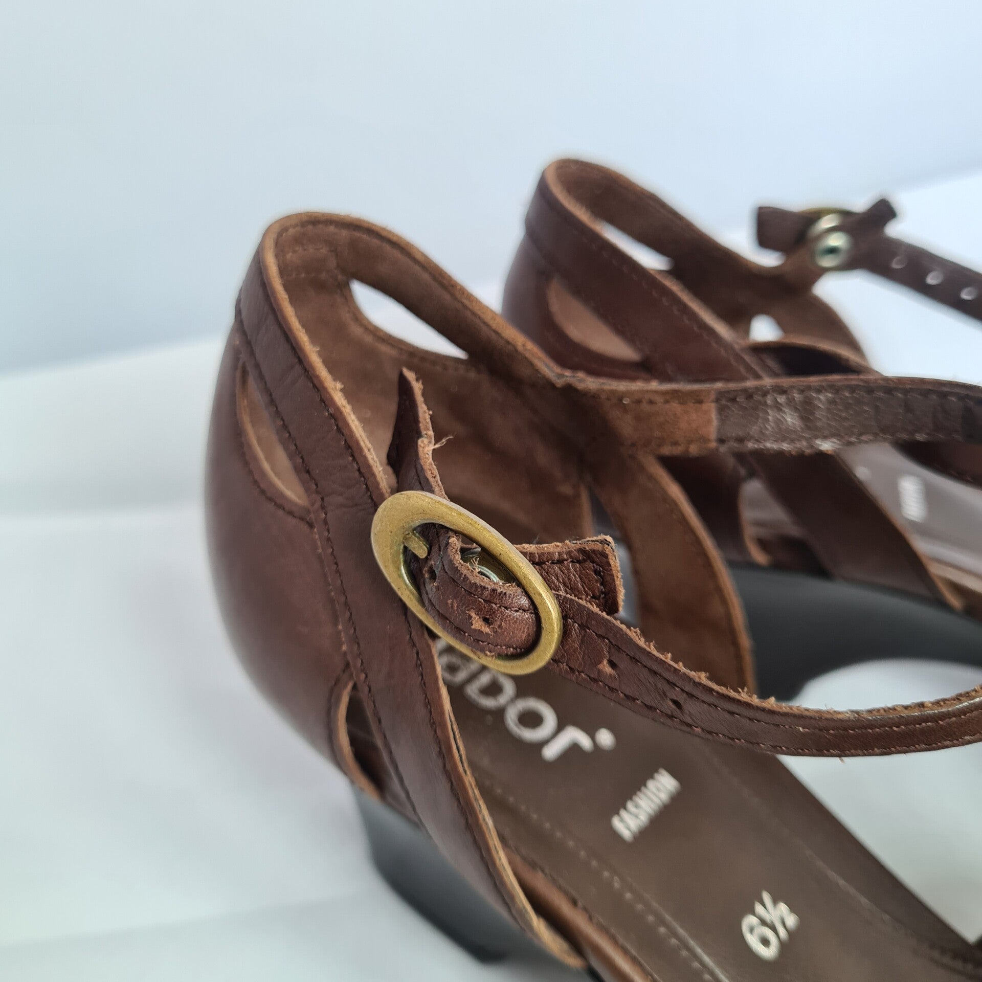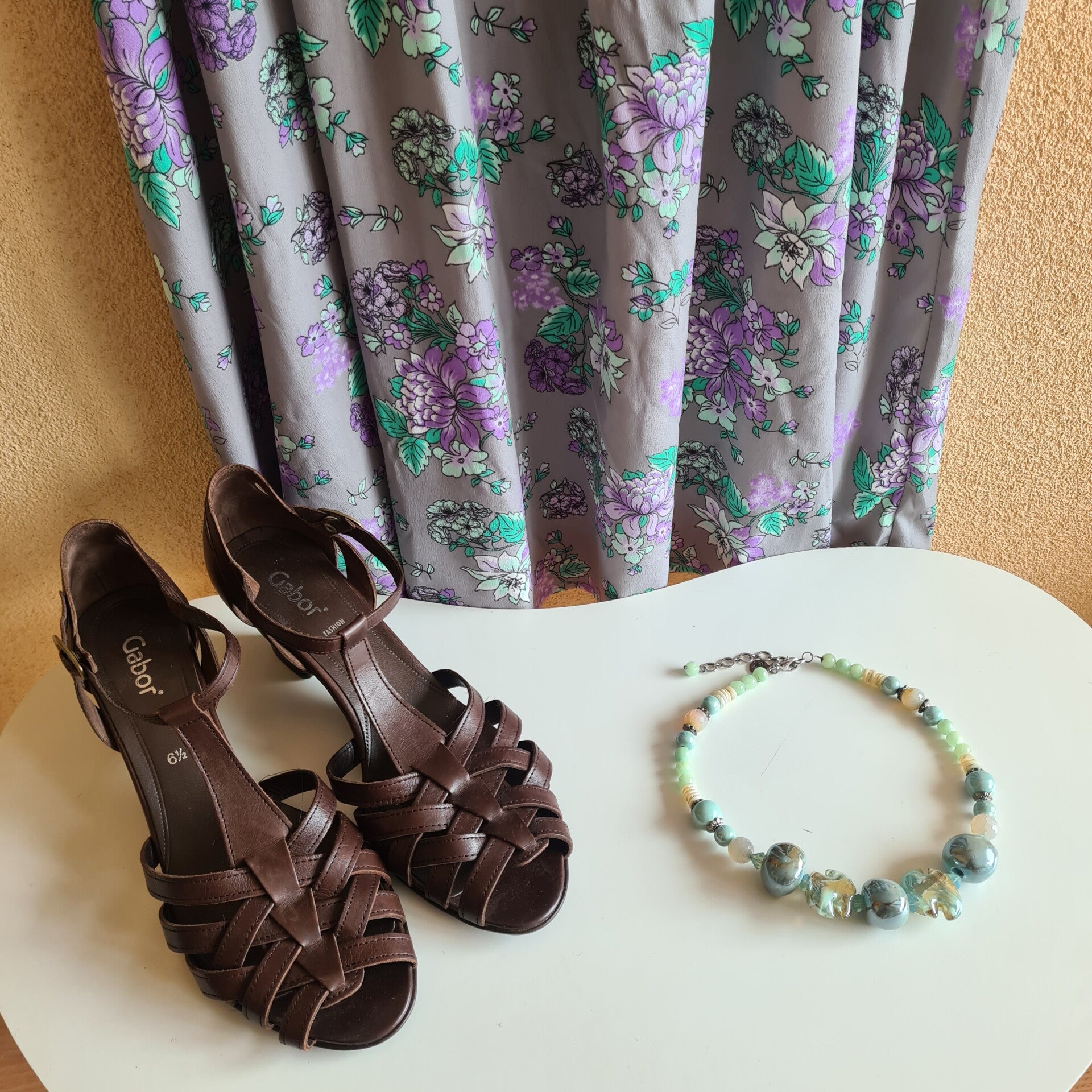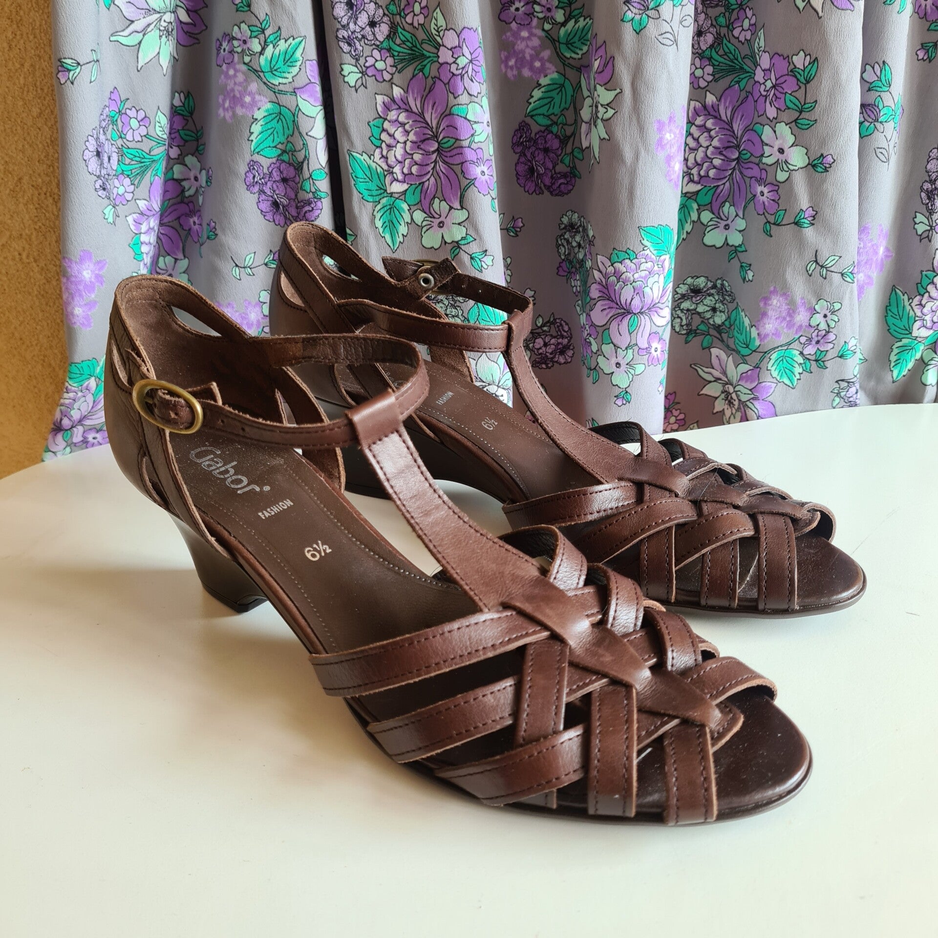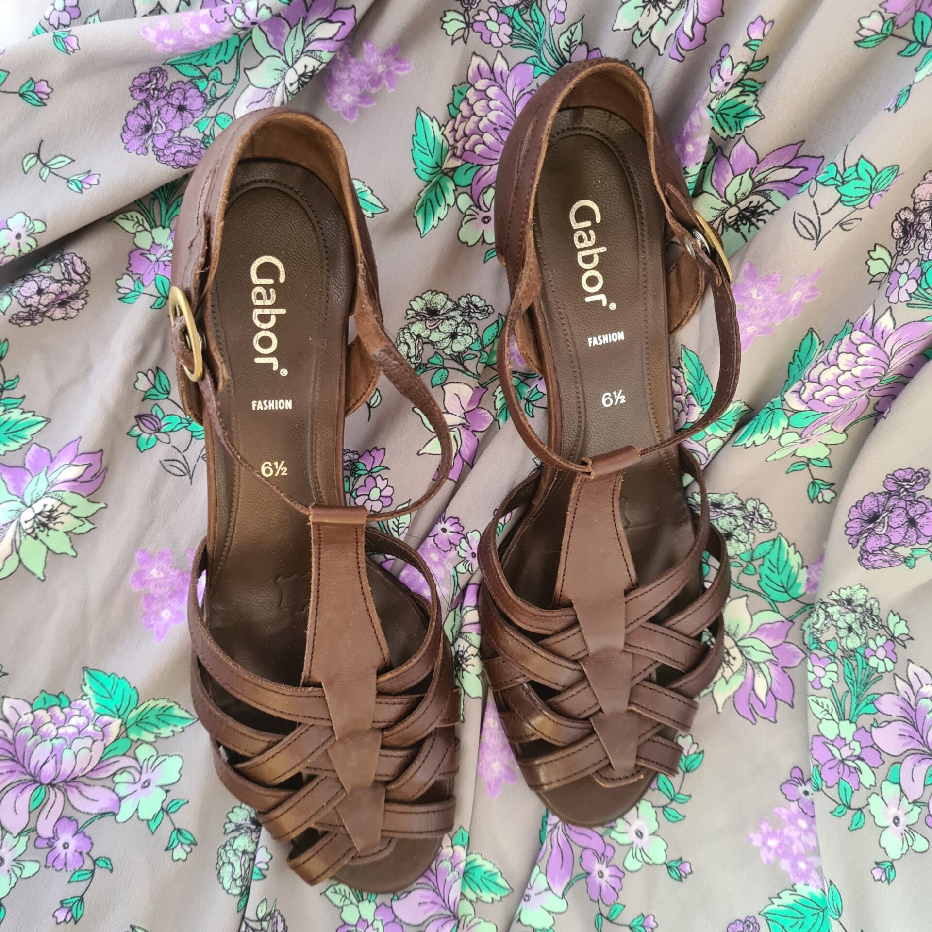 En toen vond ik deze prachtige donkerbruine sandalettes van het merk Gabor. Deze sandalettes zijn echt leer en hebben een klein comfortabel hakje van 5 cm. De bandjes sluiten d.m.v een drukknoopje super handig.De schoenen zijn in uitstekende staat en vallen als een maat 38/39. Combineer deze schoenen met de jurk lila bloem en ketting murano mint en maak je outfit compleet.