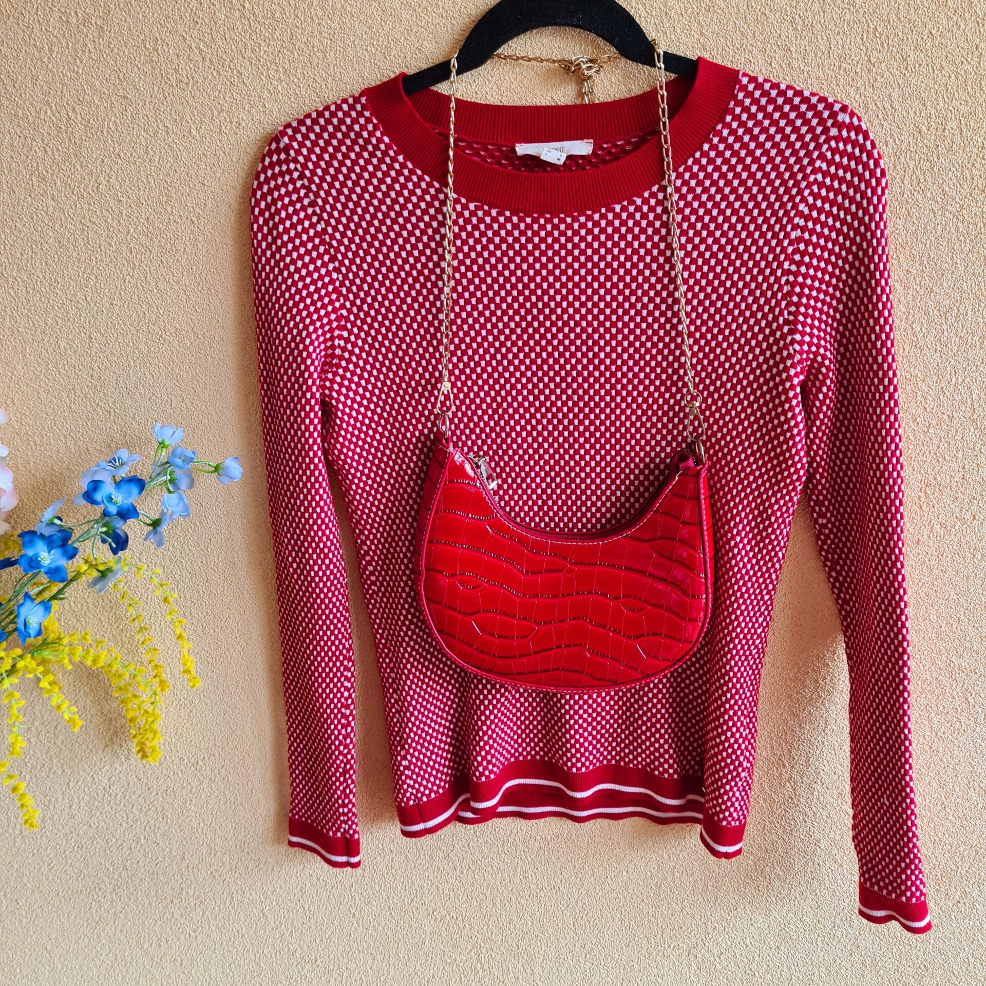 Heerlijke rood/witte pullover voor de wat koudere dagen.Draag deze op een terrasje over je schouders of om je middel.Het materiaal is lekker stretchy en zacht.Leuk te combineren met het rode croco tasje lak en zonnebril red diva.Dit item is door mij persoonlijk geselecteerd om in mijn te gekke collectie te passen.