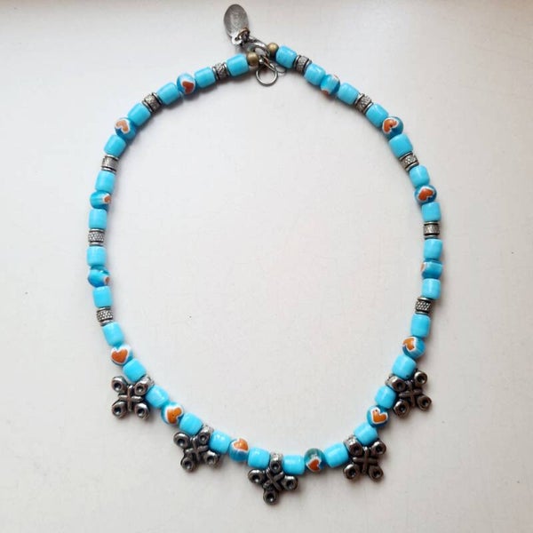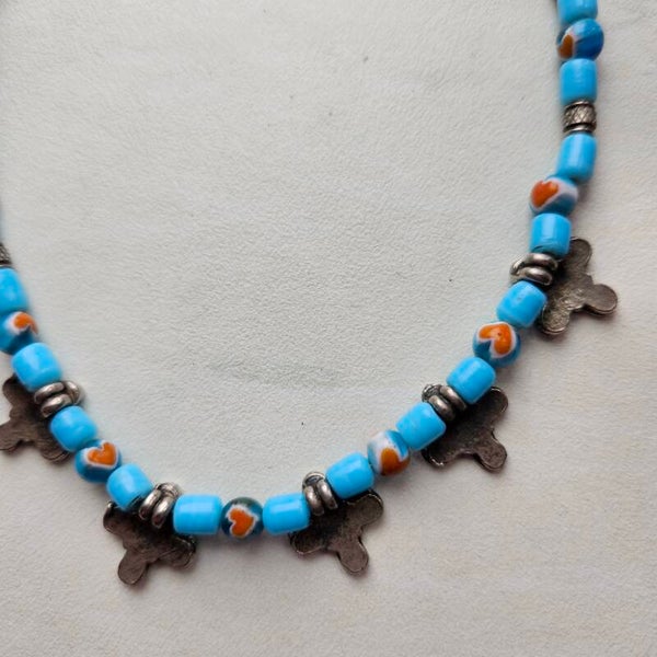 Prachtige preloved ketting van het merk Wings.Deze ketting heb ik gevonden in een tweedehands winkeltje die eenzame ouderen support met de opbrengst. Ik was specifiek op zoek naar blauwe/turquoise kleurige sieraden. Vooral in de zomer ben ik helemaal dol op deze kleur. Leuk te combineren met roze of rood of gewoon ton sur ton met verschillende kettingen.