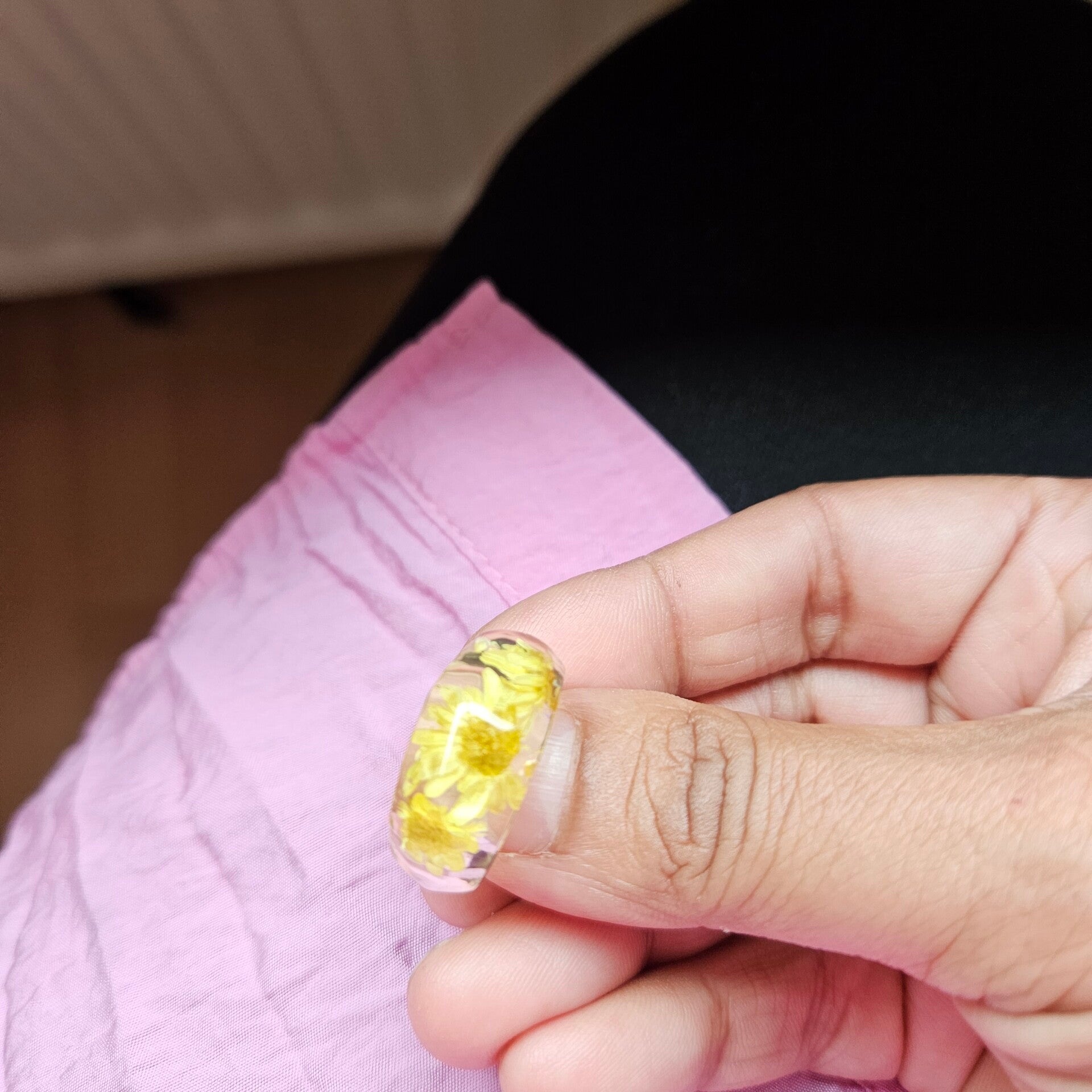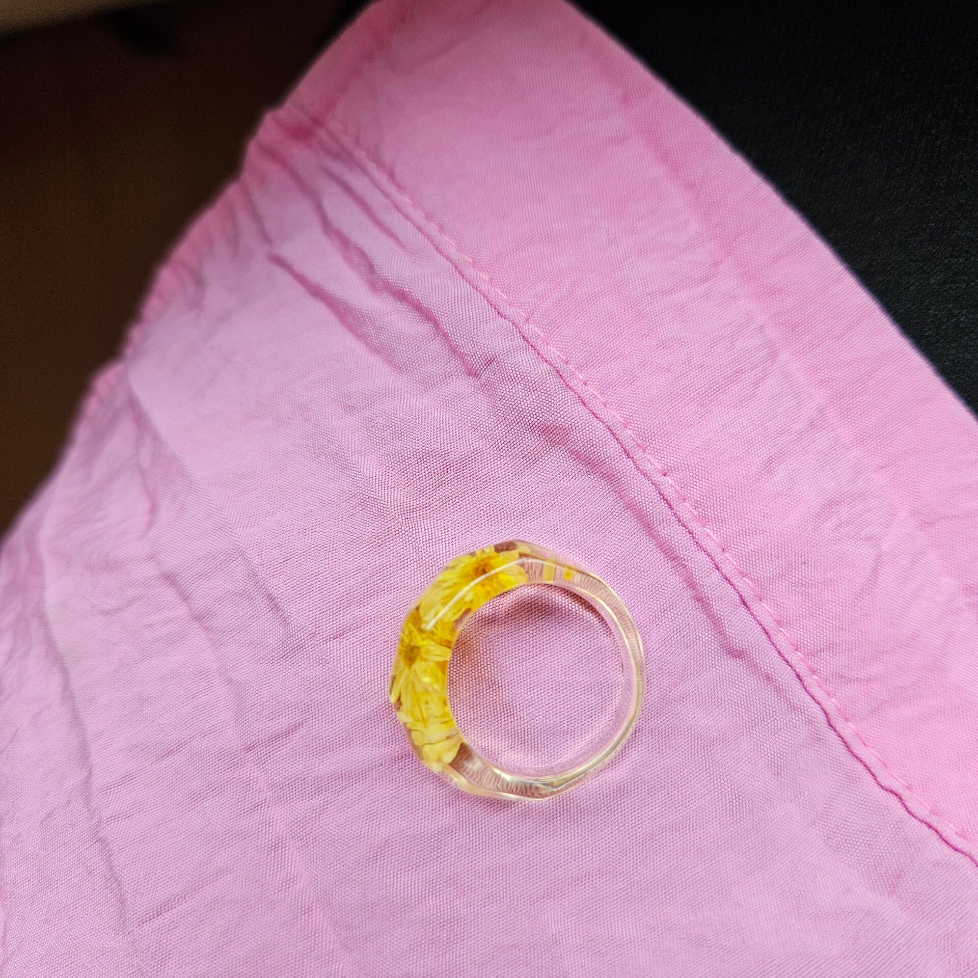 Vrolijke transparante ring van kunststof met wat lijkt op gedroogde zonnebloemen in de ring.De voorkant van de ring is facetgeslepen en geeft zo een super leuk effect.Combineer deze ring met verschillende gouden ringen of ga all out met verschillende kleuren en of materialen. Tip:Combineer deze ring met armband turquoise hart.Geel en blauw is een geweldige kleurencombinatie!
