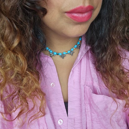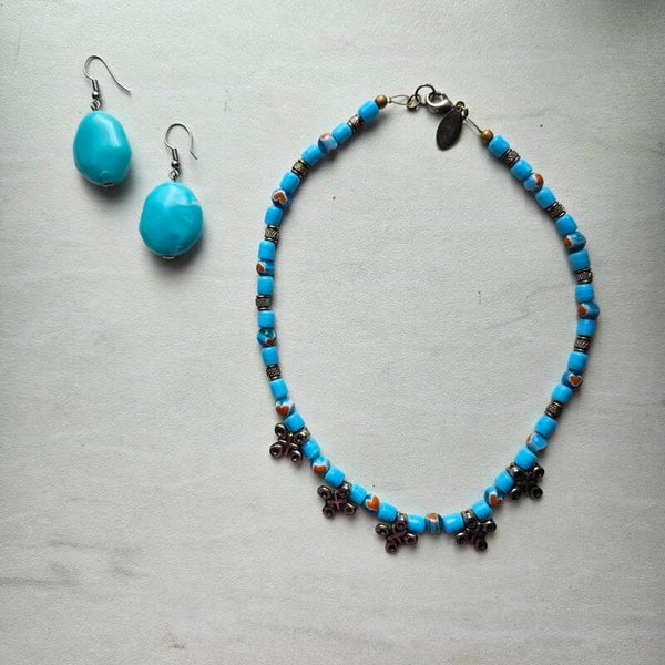 Prachtige preloved ketting van het merk Wings.Deze ketting heb ik gevonden in een tweedehands winkeltje die eenzame ouderen support met de opbrengst. Ik was specifiek op zoek naar blauwe/turquoise kleurige sieraden. Vooral in de zomer ben ik helemaal dol op deze kleur. Leuk te combineren met roze of rood of gewoon ton sur ton met verschillende kettingen.