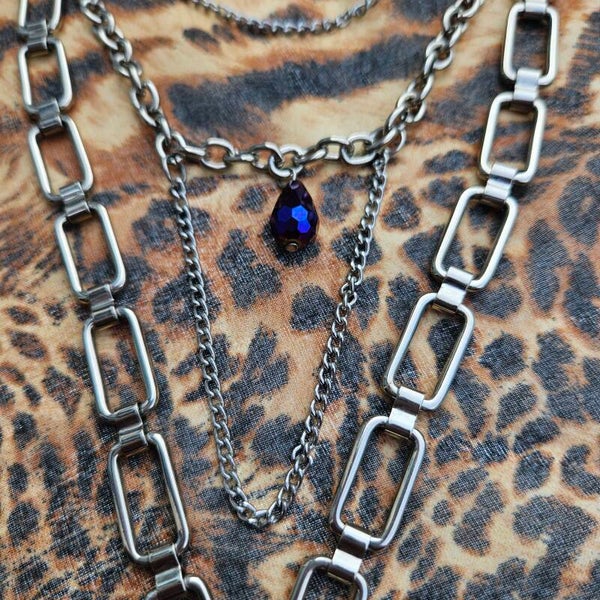 Prachtige ketting gemaakt van verschillende onderdelen. De basis van deze ketting is een heupketting uit de jaren 90 gecombineerd met andere onderdelen en een facetgeslepen druppelkraal met een metallic glans.