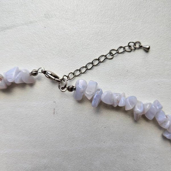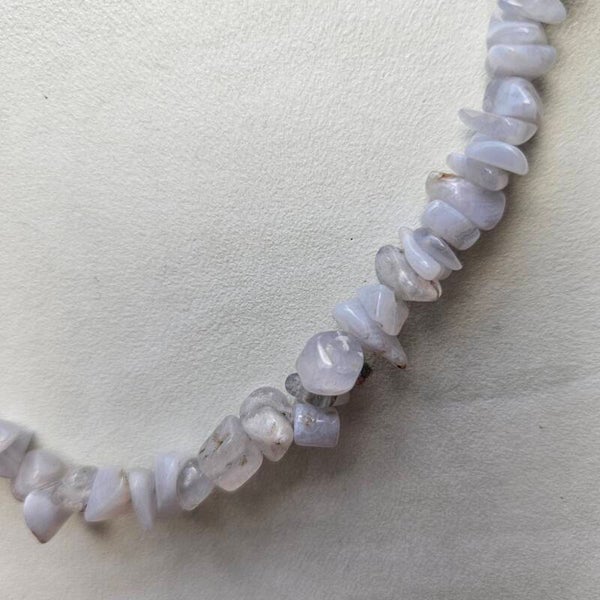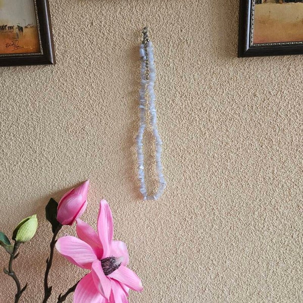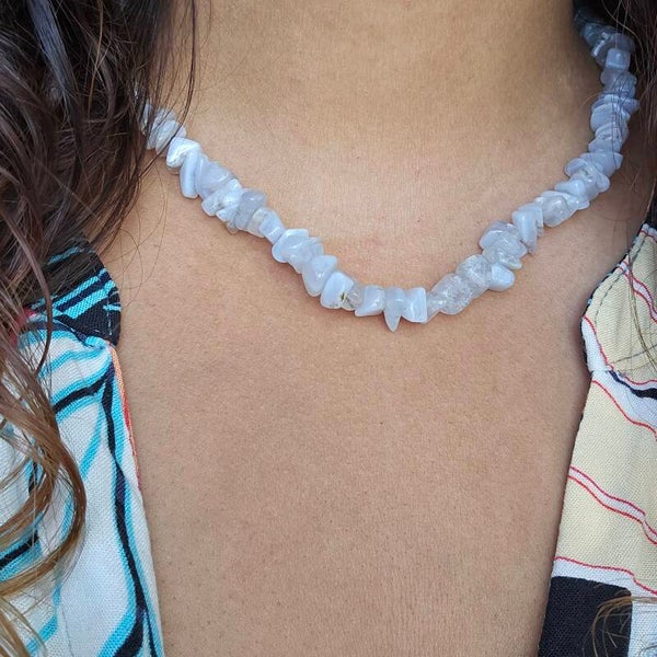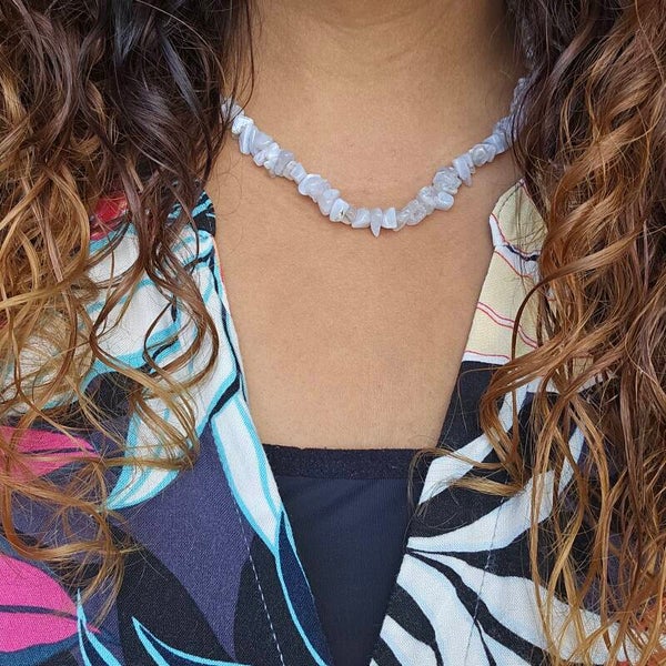 Deze ketting is gemaakt van natuursteen chips. De kralen hebben een melkachtige kleur met zacht blauwige gloed. Je kan deze sluiten d.m.v een zilverkleurige kapitelsluiting. Combineer deze ketting met ander natuursteen sieraden en maak je look compleet. Draag de ketting met verschillende kettingen in lagen of gewoon enkel om het de eyecatcher van je outfit te maken.