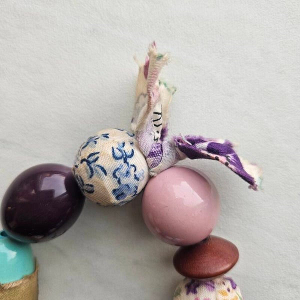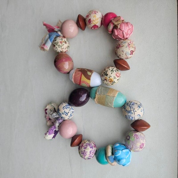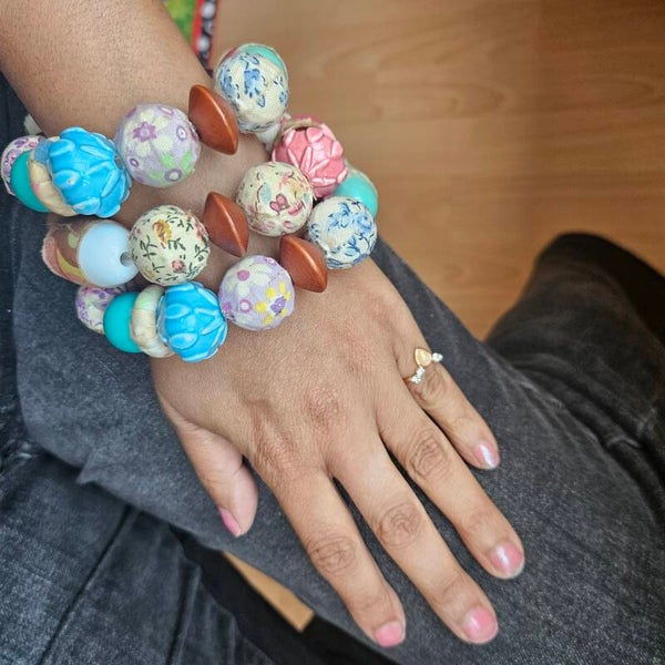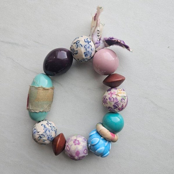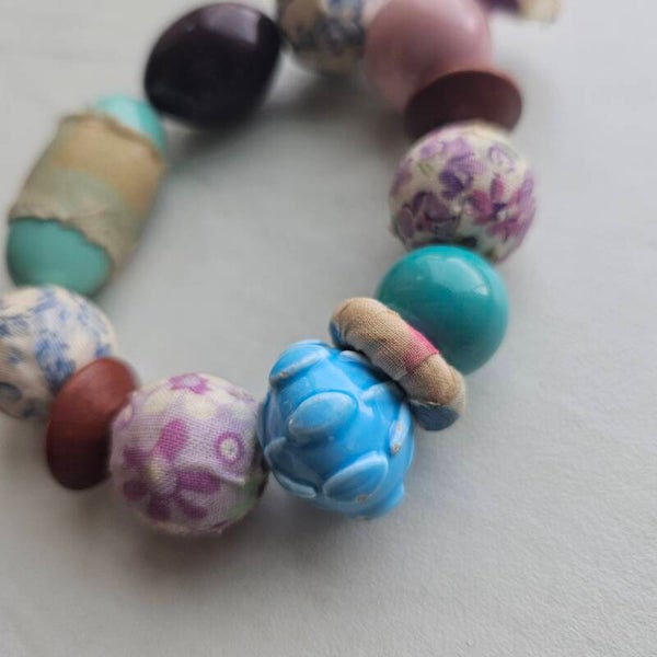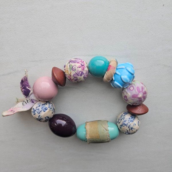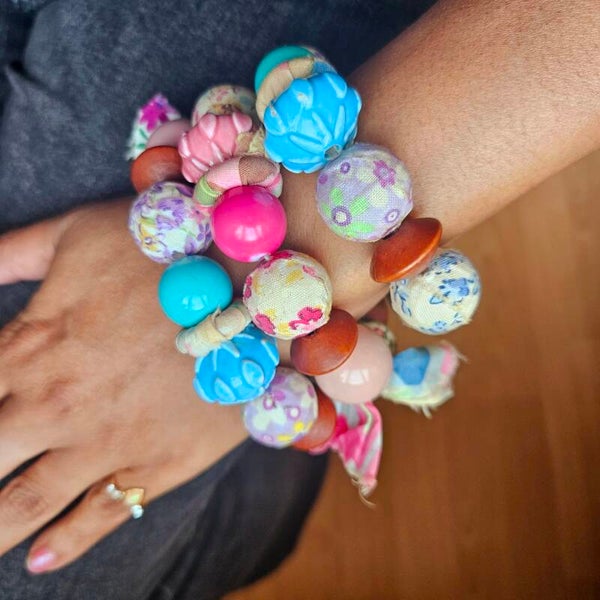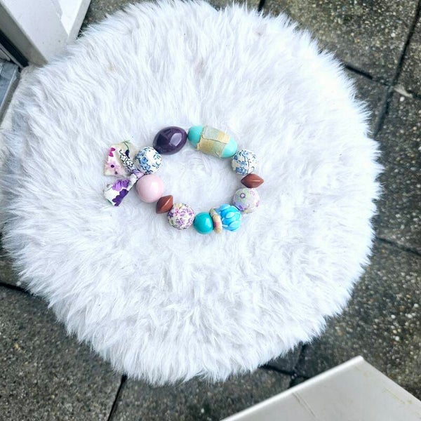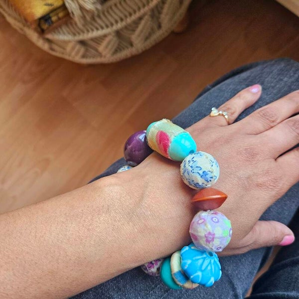 Deze te gekke armband is lekker chunky en is gemaakt van verschillende materialen. Juist door de kleuren en materiaal combinatie van keramiek, textiel en hout is het een echte eyecatcher.Combineer deze armband met andere chunky gouden of zilverkleurige armbanden of met de roze variant die nu ook verkrijgbaar is in de webshop. Ondanks de frisse kleuren is deze zowel in het voorjaar als najaar goed te combineren met je outfit.