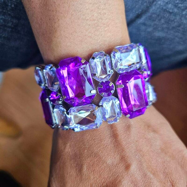 Wat een prachtig exemplaar. Im in love.....Deze armband is ideaal voor de feestdagen maar uiteraard ook daarna leuk te combineren met je basic outfit. Deze armband is gemaakt van grote paarse en lila strass stenen en is een echte eyecatcher. Persoonlijk zou ik met mijn outfit alleen deze armband omdoen. Als je wilt kan je nog 1 of 2 zilverkleurige chunky armbanden omdoen voor het extra Wow effect. Maar de armband is breed en opvallend genoeg om je outfit compleet te maken. Wel is het een goed idee om een kleurrijke ketting of zilverkleurige ketting om te doen. Maar goed jij bent de baas over je eigen stijl en sky is the limit!