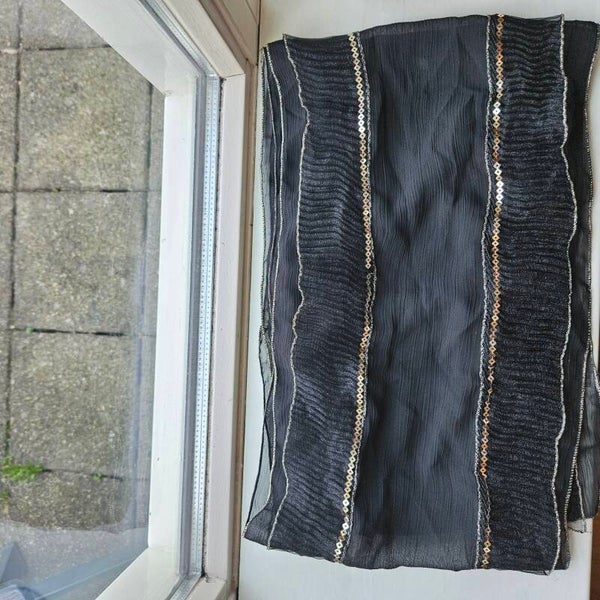 Wat een beauty. Deze zwarte lange sjaal bezet met goudkleurige pailletten maakt overal een feest van. Combineer deze sjaal op een all black outfit of gewoon met een basic shirt en jeans. Hoe leuk! Ik heb deze persoonlijk gecombineerd met mijn tijgerprint top want ik hou heel erg van contrast. Stijl is persoonlijk doe waar jij je goed bij voelt en wat bij je past.