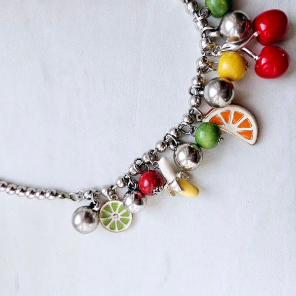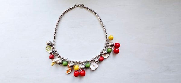 Te gekke statement ketting met verschillende fruitbedels.Kersen,banaan,sinasappel, citroen etc..De prachtige kleurencombinatie maakt deze ketting tot the ultimate zomeraccessoire.
