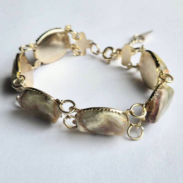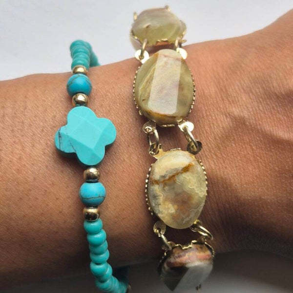 Prachtige goudkleurige armband bezet met echt natuursteen.Combineer deze met verschillende gouden armbandjes en bijpassende ketting.Hebben?Twijfel niet te lang want Weg=Weg