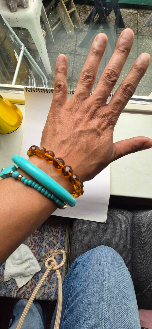 Prachtige armband met facet geslepen glaskralen in een zachte karamel kleur.Combineer deze armband met verschillende gouden of zilverkleurige armbanden.Mijn favoriet voor de zomer is turquoise met bruin.