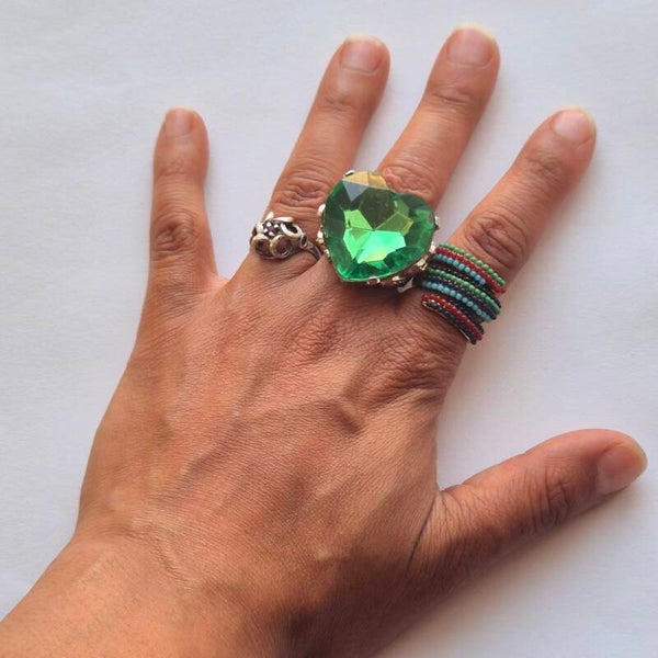 Prachtige zilverkleurige ring met een enorm hart in een mooie groene kleur.De ring is zilverkleurig en heeft een grote strasssteen van kunststof.Let op het is een knijpring dus deze past om elke vinger.Combineer deze ring met verschillende andere ringen en maak een statement.