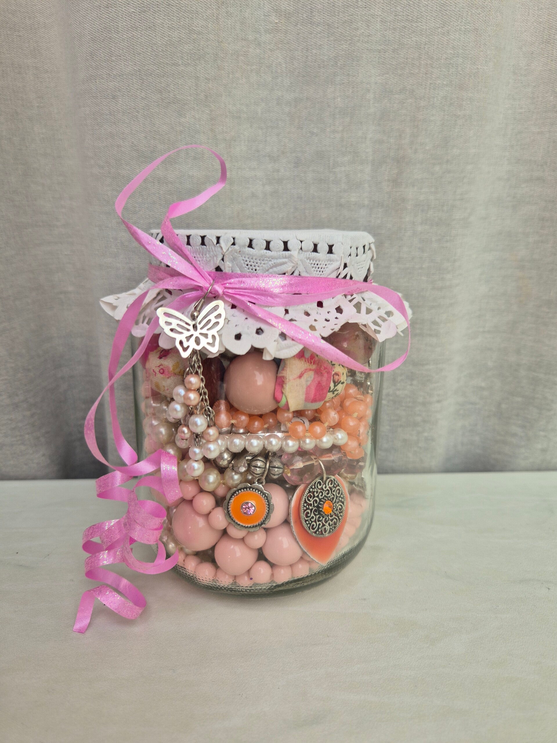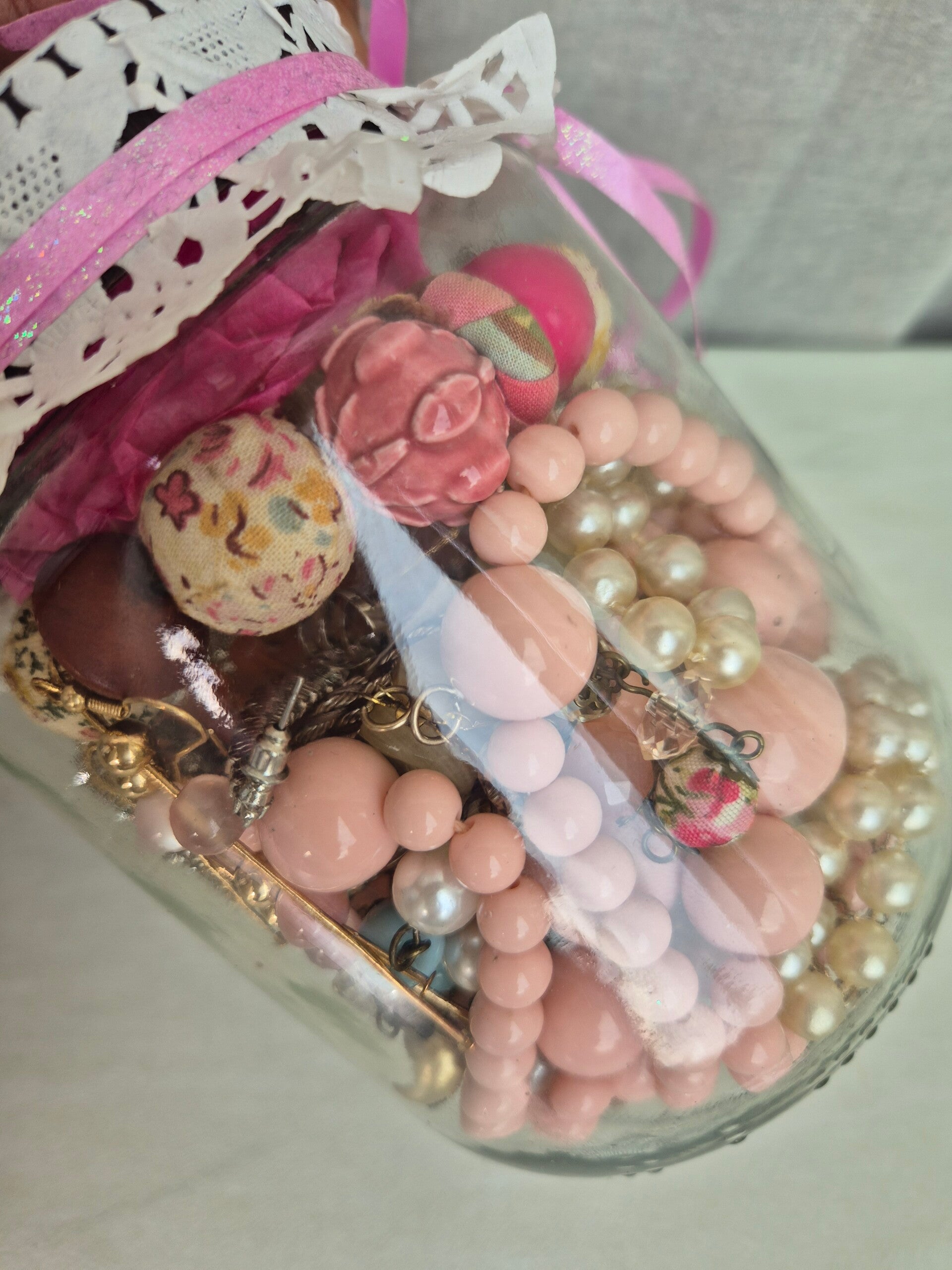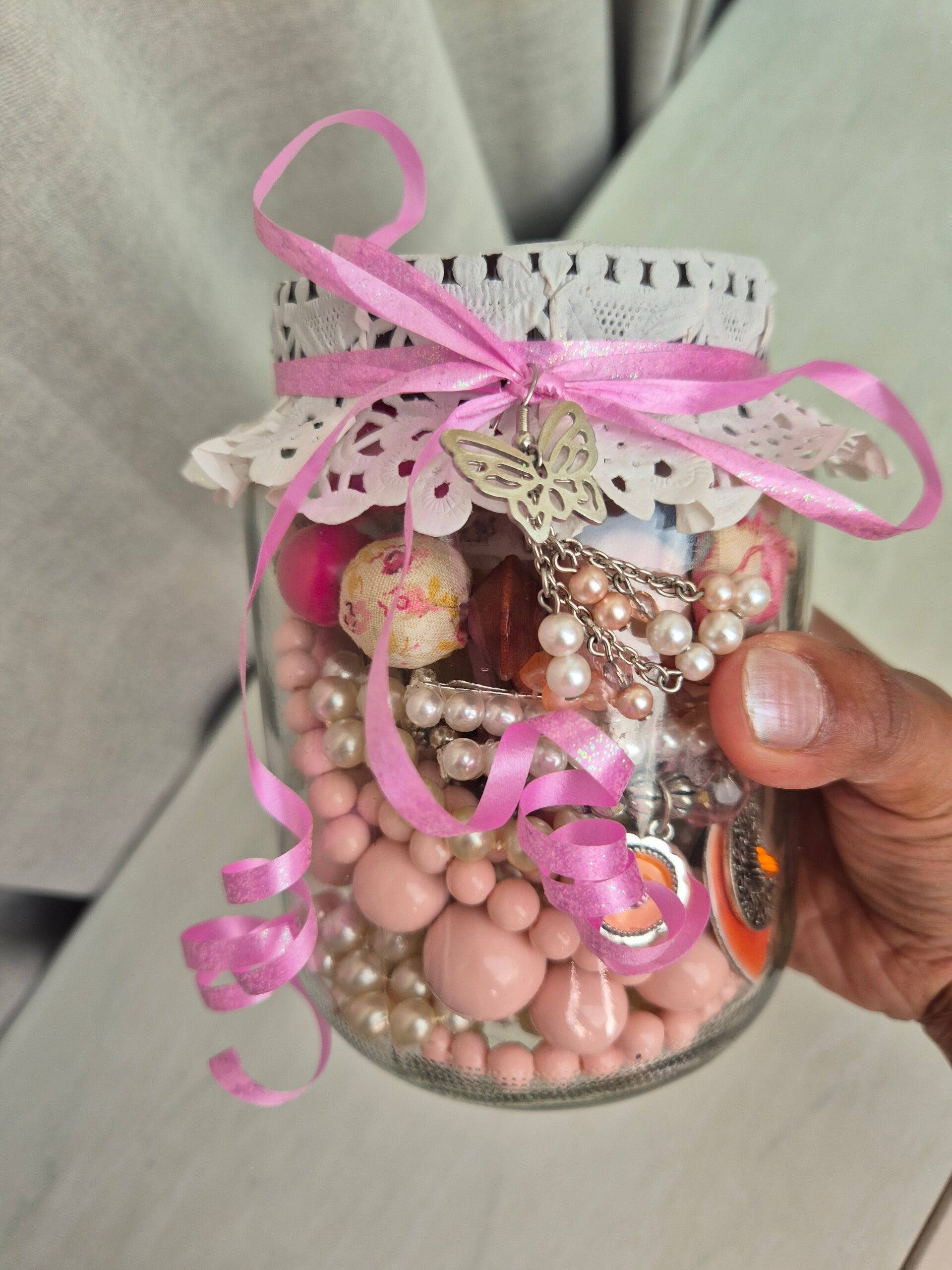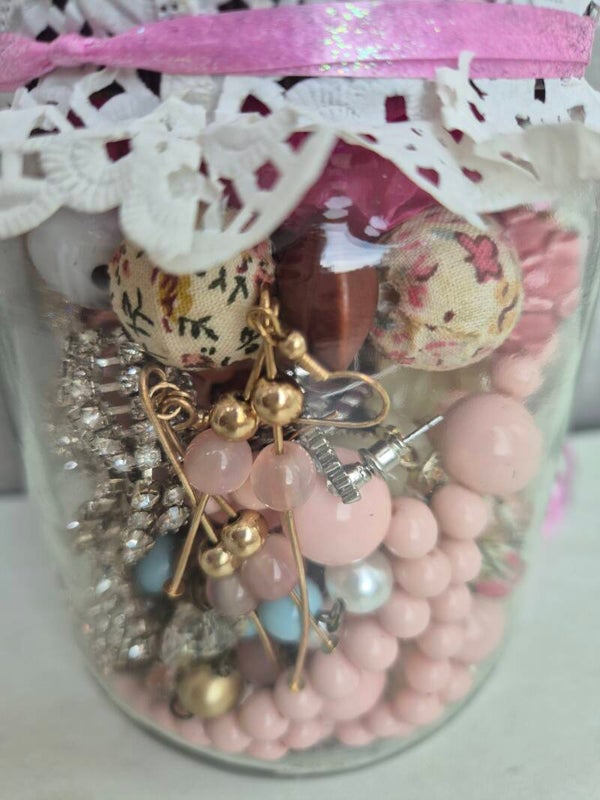Amazing mystery jewelry jar with lots of pink tones.This jar is filled with preloved jewelry and accessories.Getting curious order quickly because all jars are one of a kind.