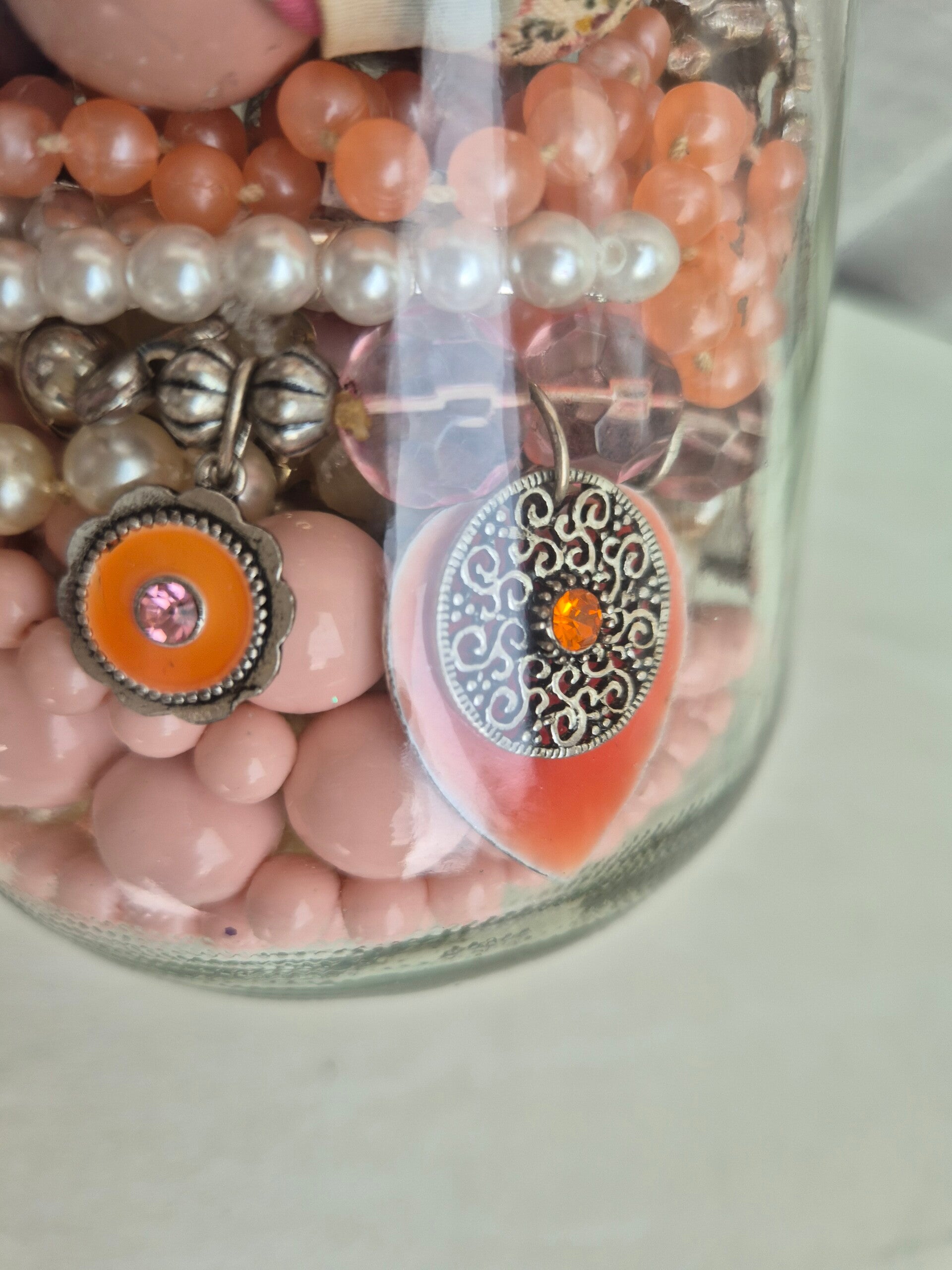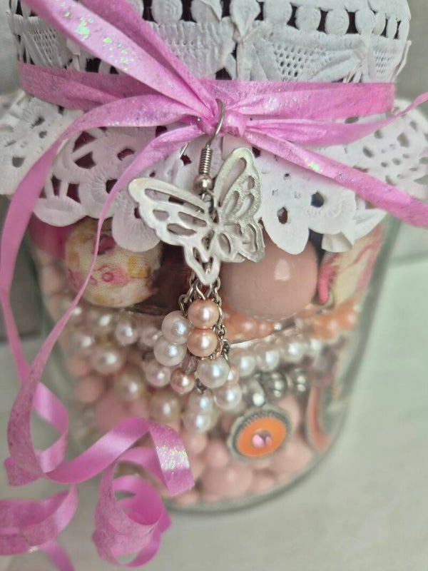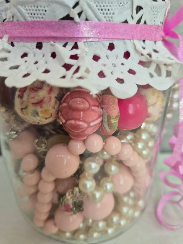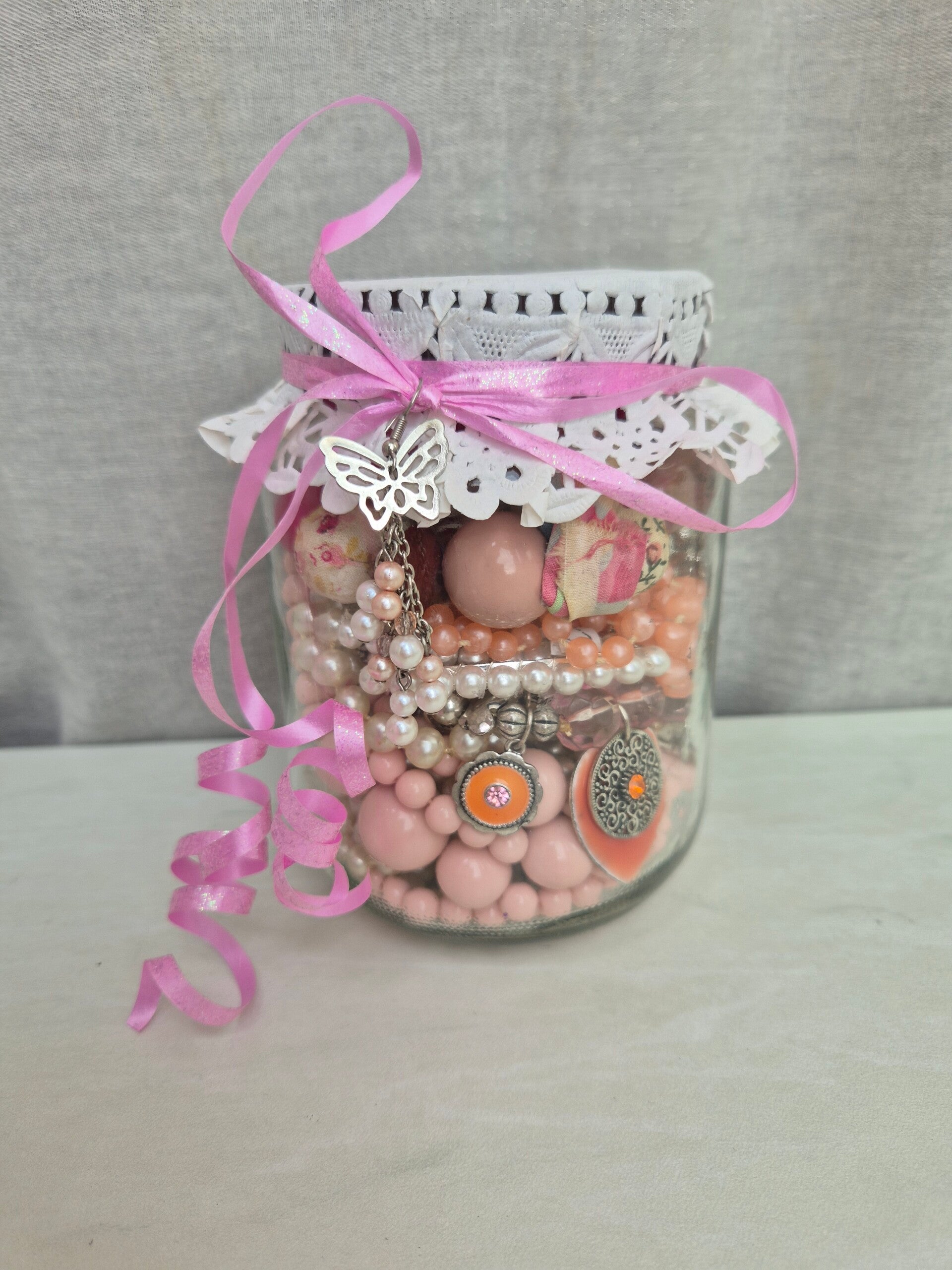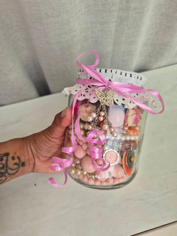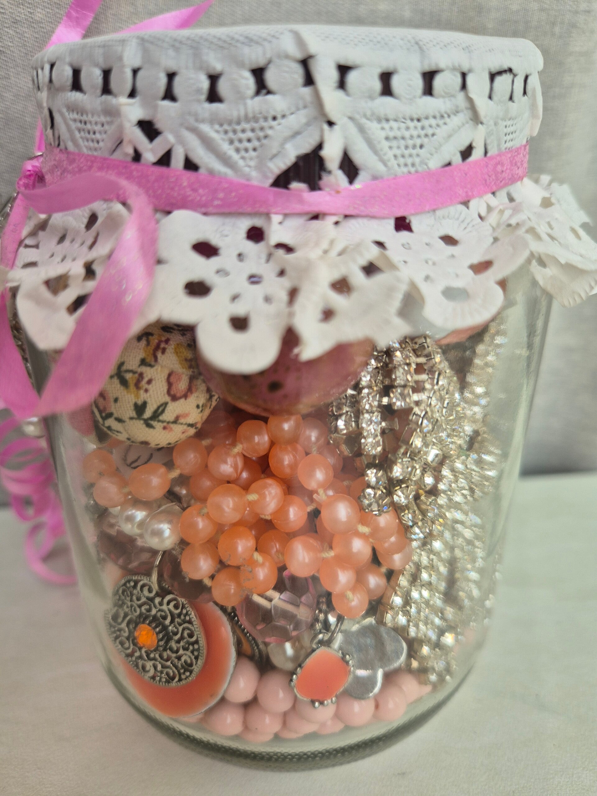 Amazing mystery jewelry jar with lots of pink tones.This jar is filled with preloved jewelry and accessories.Getting curious order quickly because all jars are one of a kind.