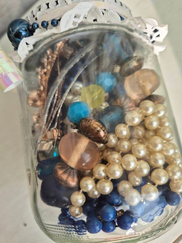 Amazing mystery jewelry jar of blue tones that remindsme of the beautiful ocean.This jar is filled with preloved jewelry and accessories.Getting curious? Order quickly because this jar is one of a kind and is impossible to remake.