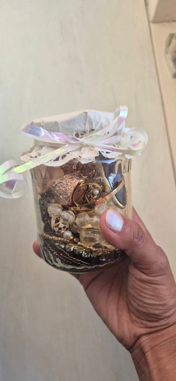 Beautiful mystery jewelry jar of golden tones.This jar is filled with preloved jewelry and accessories.Gold coloured pieces and some are stainless steel.Getting curious?Order quickly because each jar is one of a kind.The jars are impossible to remake due to the unique preloved pieces.