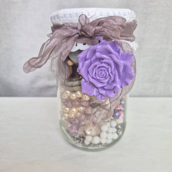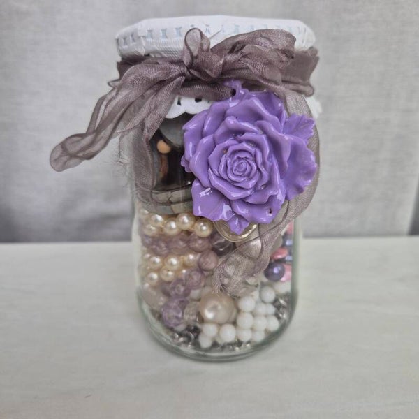 Beautiful mystery jewelry jar filled with preloved jewelry and accessories. The items are all pearl,white,silver and lila/purple coloured.Soft tones and textures.Are you curious?Order quickly because all jars are unique and will not be remaked.