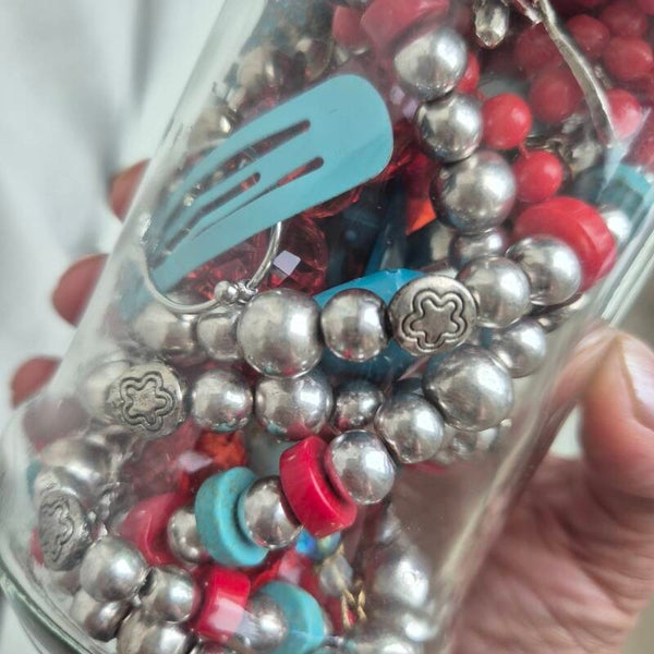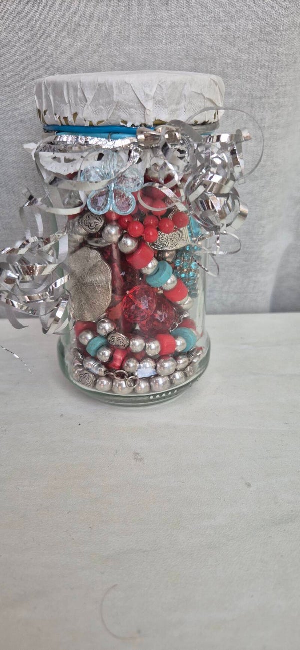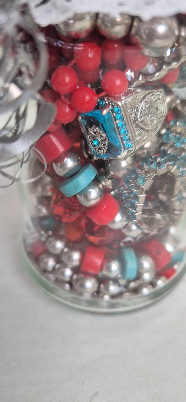 Amazing mystery jewelry jar filled with preloved jewelry and accessories. The items are all red,turquoise,silver coloured.All jars are unique and filled with one of a kind pieces.Are you interested?Don't hesitate to order because Sold =Sold. No remakes of the jars.