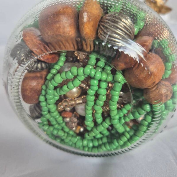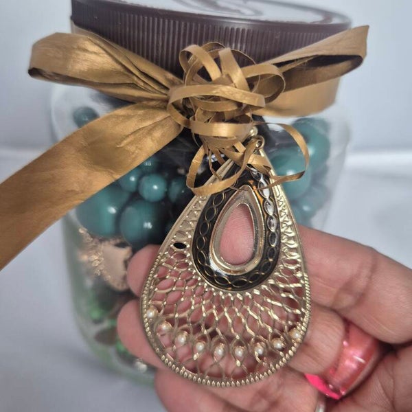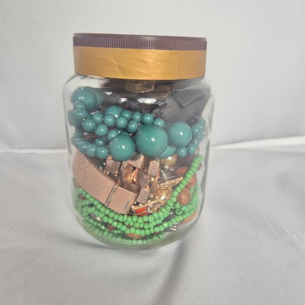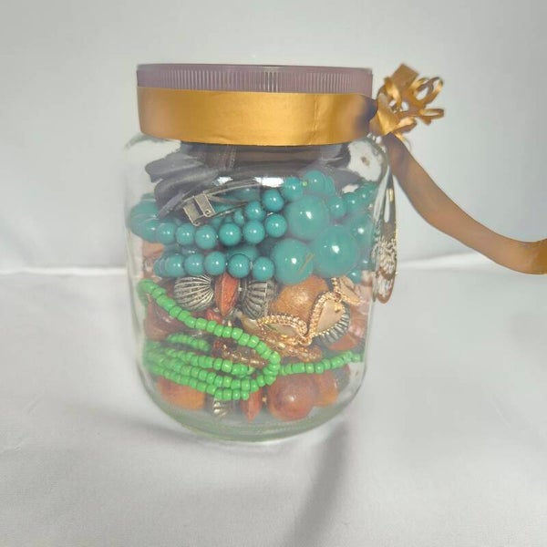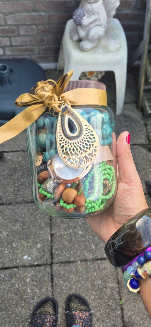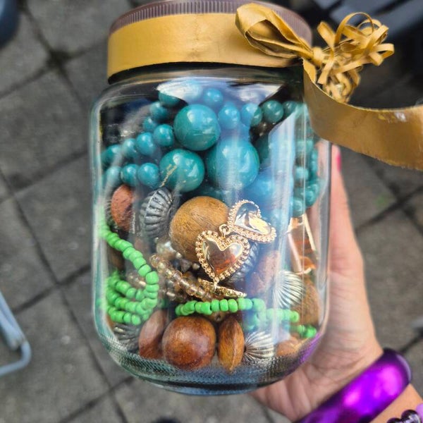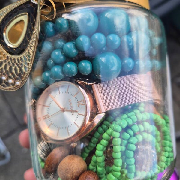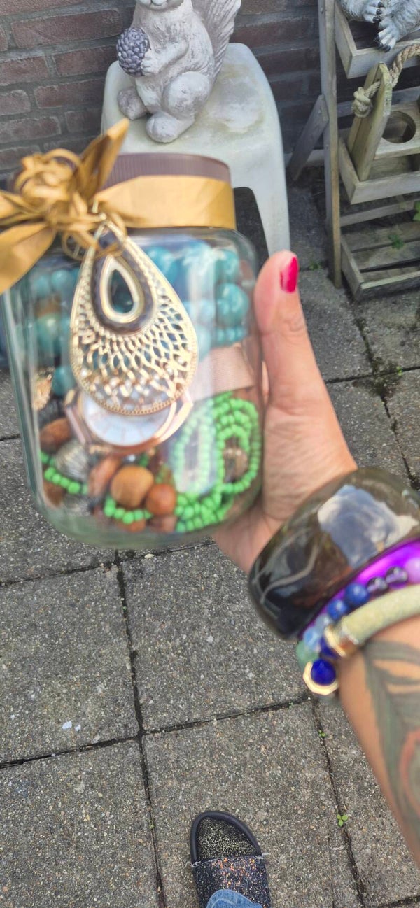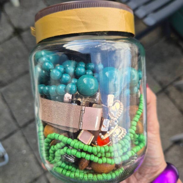Ontdek onze geweldige mystery sieradenpot met warme groene herfsttinten en een vleugje hout. Deze unieke pot is gevuld met pre-loved sieraden, waaronder stoere, opvallende kettingen en meer. Let op: er zit geen echt goud of zilver in, alles is custom jewelry.