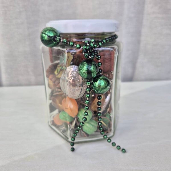 Een betoverende mystery jar gevuld met een mix van sieraden en accessoires. De groene, gele en bruine tinten vormen samen een prachtige combinatie die doet denken aan een lange wandeling door het bos — vol verborgen schatten en kleine wondertjes van de natuur.