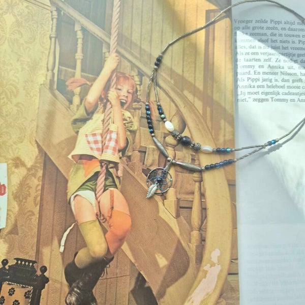 Wauw wat een mooie ketting gemaakt van metalen kralen afgewisseld met zwarte,beige en kralen met een metallic/oliegloed. De combinatie van de kleuren en verschillende kralen maakt dit tot een echte statement.De hanger is een dromenvanger met gespannen blauwe draad een kraal en metalen veer.Draag deze op een basic shirt met jeans of combineer hem met 1 van de kleurrijke oorbellen uit de shop.Sky is the limit!