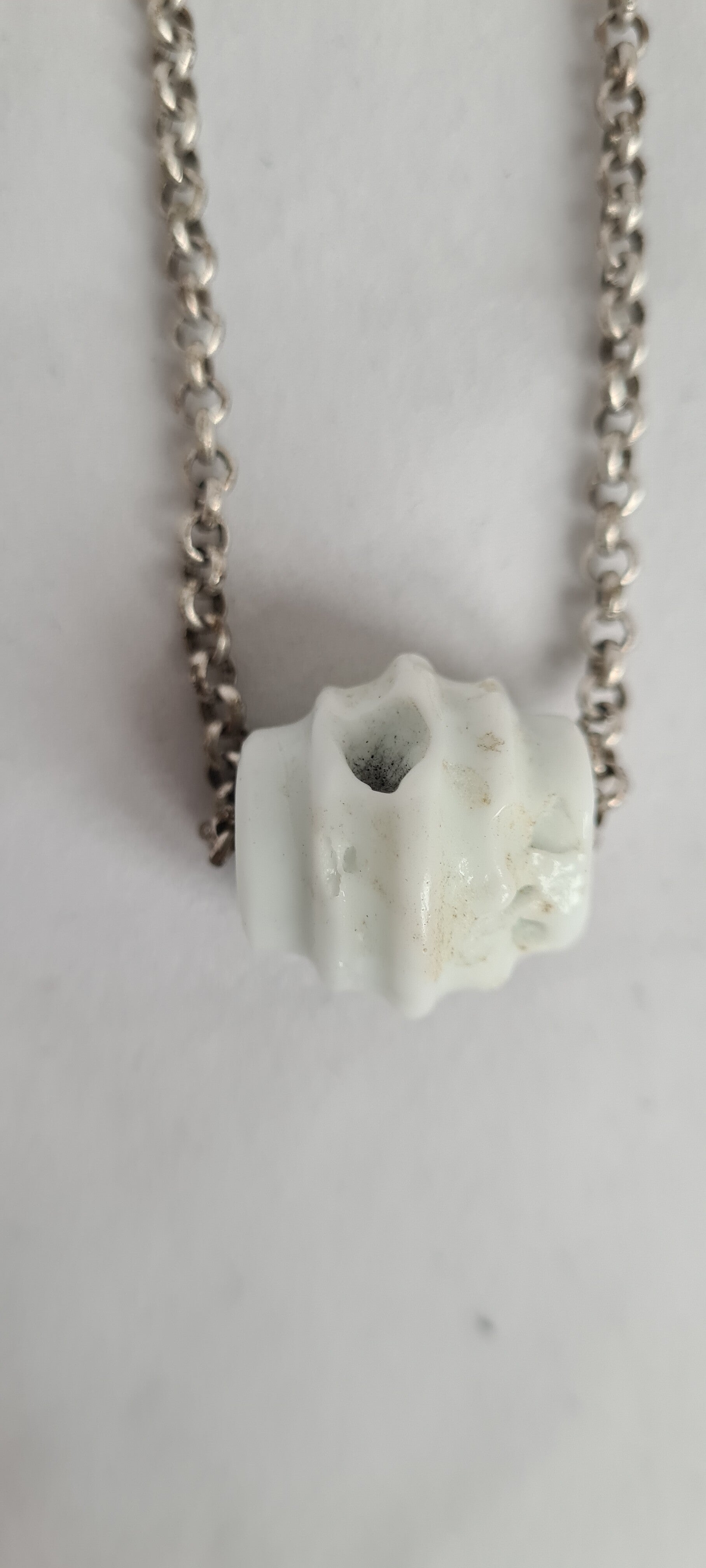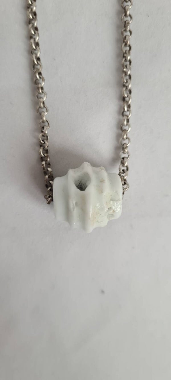 Prachtige handgemaakte ketting met een hanger van keramiek.Deze hanger is beige en is uniek in zijn soort.Deze ketting is met de handgemaakt door Into Accessories van gerecyclede materialen.Wij geven graag de sieraden een tweede leven.Into ZEROWASTE