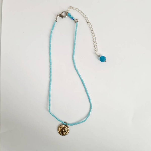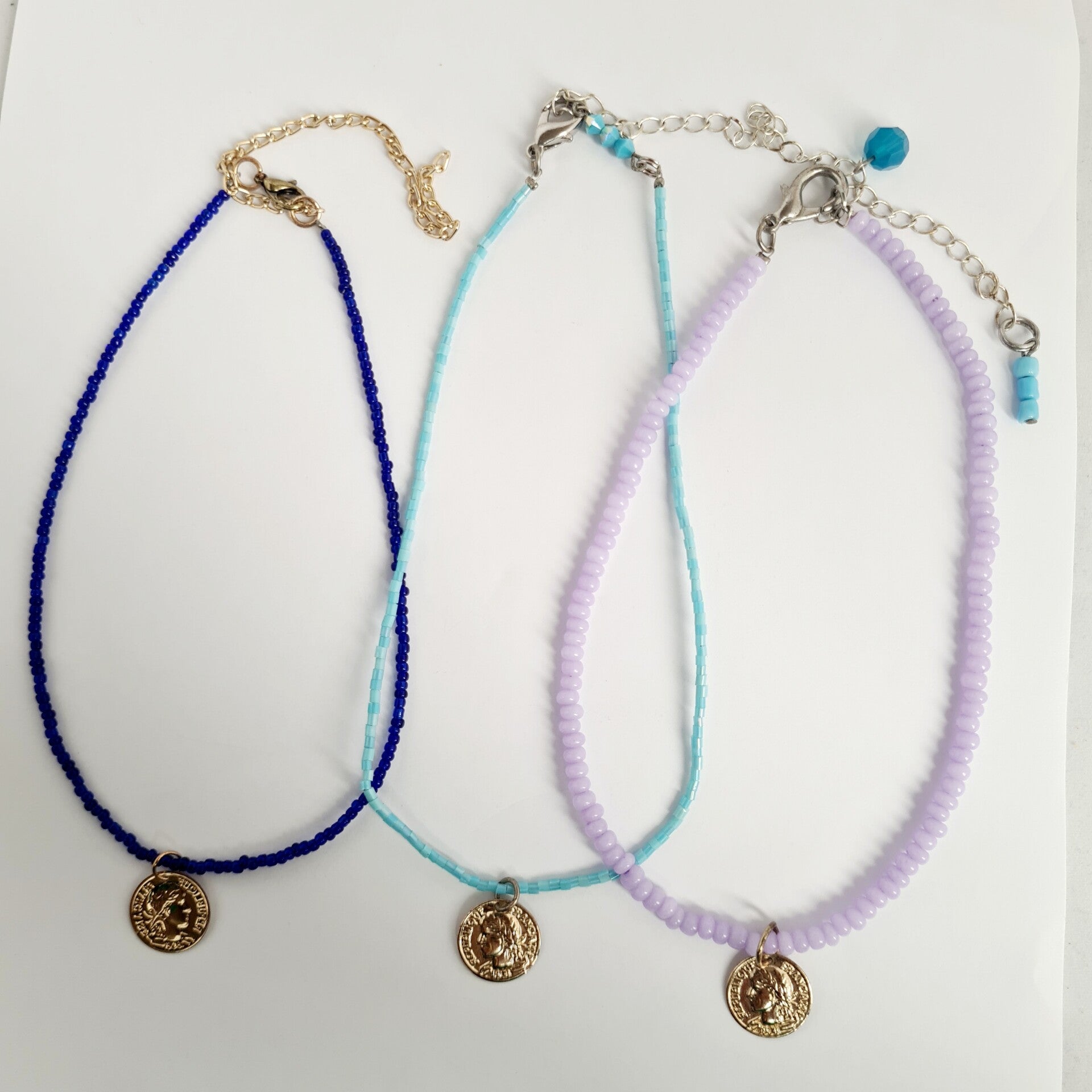 Prachtige kralen ketting met een gouden munt als hanger. Deze ketting komt uit onze collectie Summer handmade by into-accessories. One of a kind.Deze ketting is met de handgemaakt by into-accessories. Alle sieraden worden gemaakt in beperkte oplage van verschillende gerecyclede onderdelen.We are INTO zerowaste Combineer deze met verschillende kettingen en creer je eigen styl.